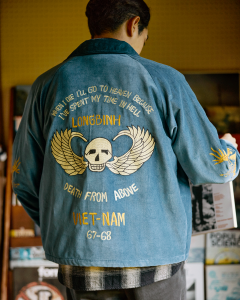 ベトナム戦争時にスーベニアアイテムとして作られたジャケットの刺繍をデザインに落とし込みました。