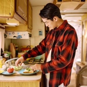 ファブリックには、グラデーションのように色が移ろうオンブレーチェックを採用。生地と製品の両段階で洗い加工を施し、柔らかな着心地とヴィンテージライクな表情に仕上げました。